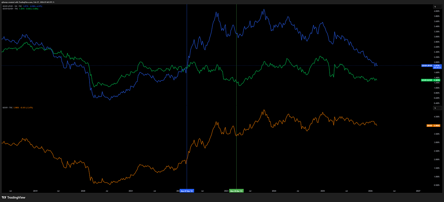 US 10y nominal yield differentials versus Japan and Europe are at their lowest since March 2022 and March 2023, respectively. Both of those proved to be horrendous times to own Treasuries.
