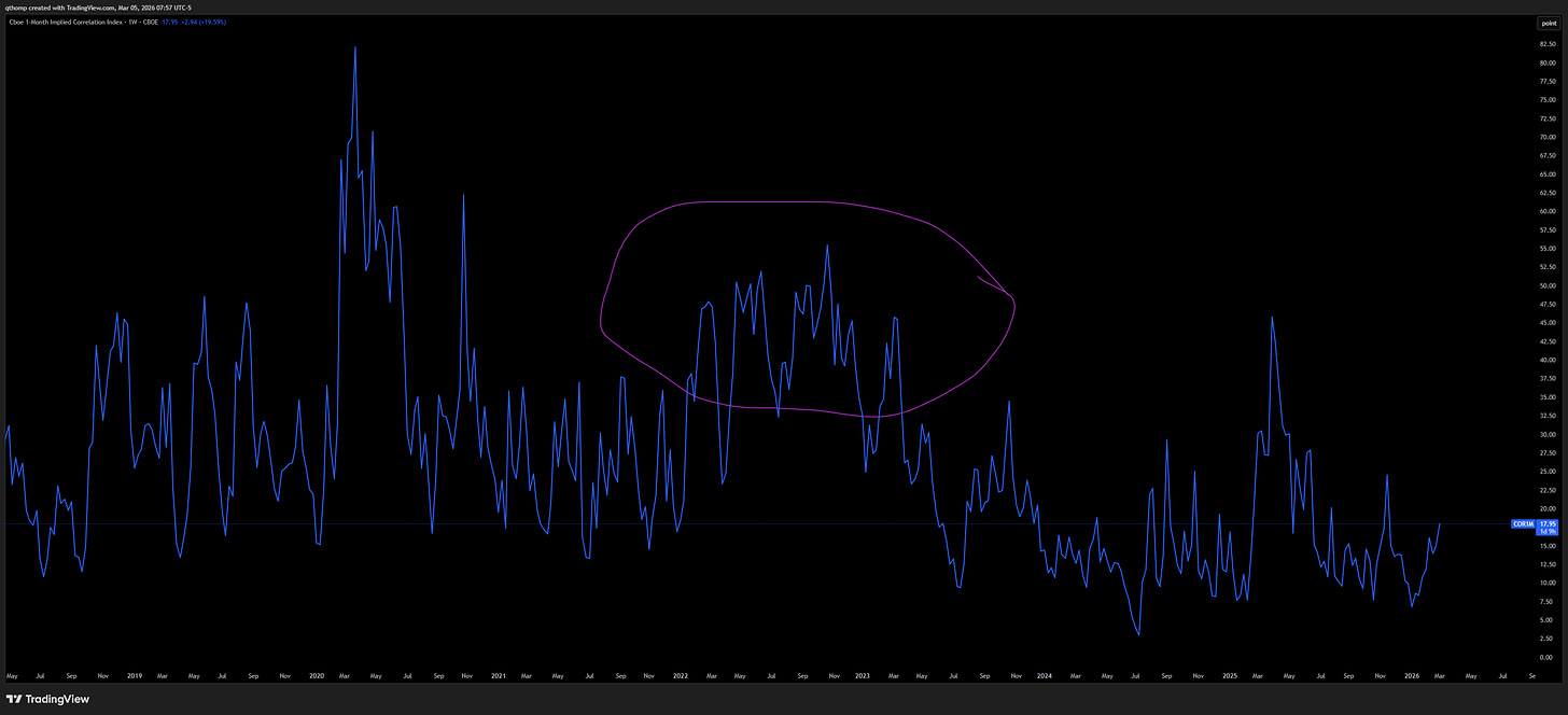 As we all are playing hot potato across violent sector rotations, it’s important to remember that cash is a position, and sometimes the best position. There is a lot of room for stock market correlations to increase off the record low base that has formed. Heck, even another 2022 analog for you. In simple terms, this means everything down together where not even metals are safe should be on your 2026 bingo card.
