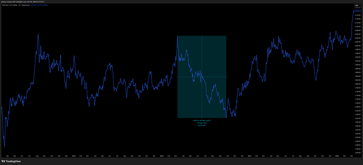I’ve been discussing for awhile now that I think the ‘run it hot’ narrative will be tested. With no new material midterm-driven stimulus measures enacted nor meaningful Fed liquidity support, the two key ingredients for ‘nothing stops this train’ are missing. Given that, even the winning gold and metals trades can be tested. After all, gold had a -21% drawdown in 2022.